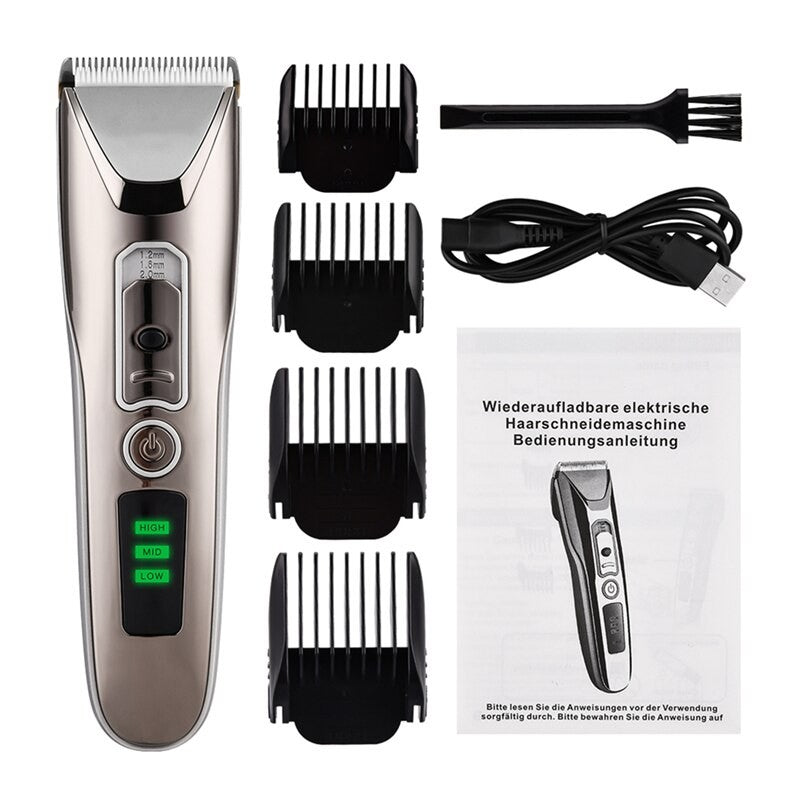 Your purchase includes everything you need to get started: one hair clipper, four limit combs (3mm, 6mm, 9mm, 12mm), a USB charging cable, a cleaning brush, and a user manual. These accessories make it easy to maintain your clippers and achieve the perfect haircut every time.
