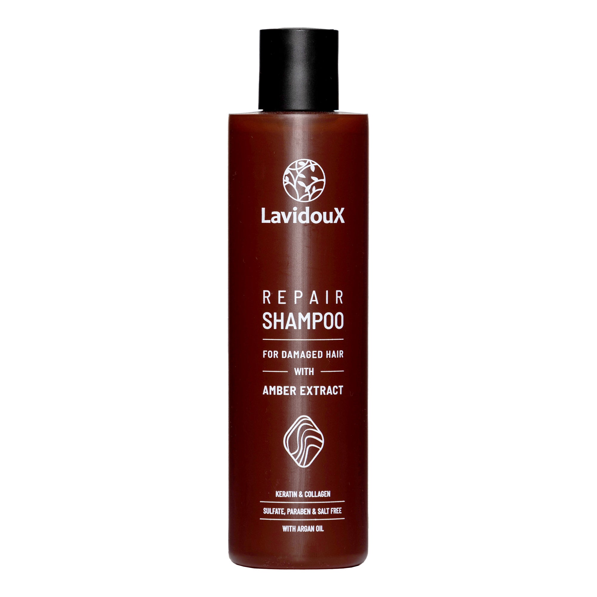 Bottle of Hair Repair Shampoo with Amber Extract and Argan Oil, designed for damaged hair, 250 ml.