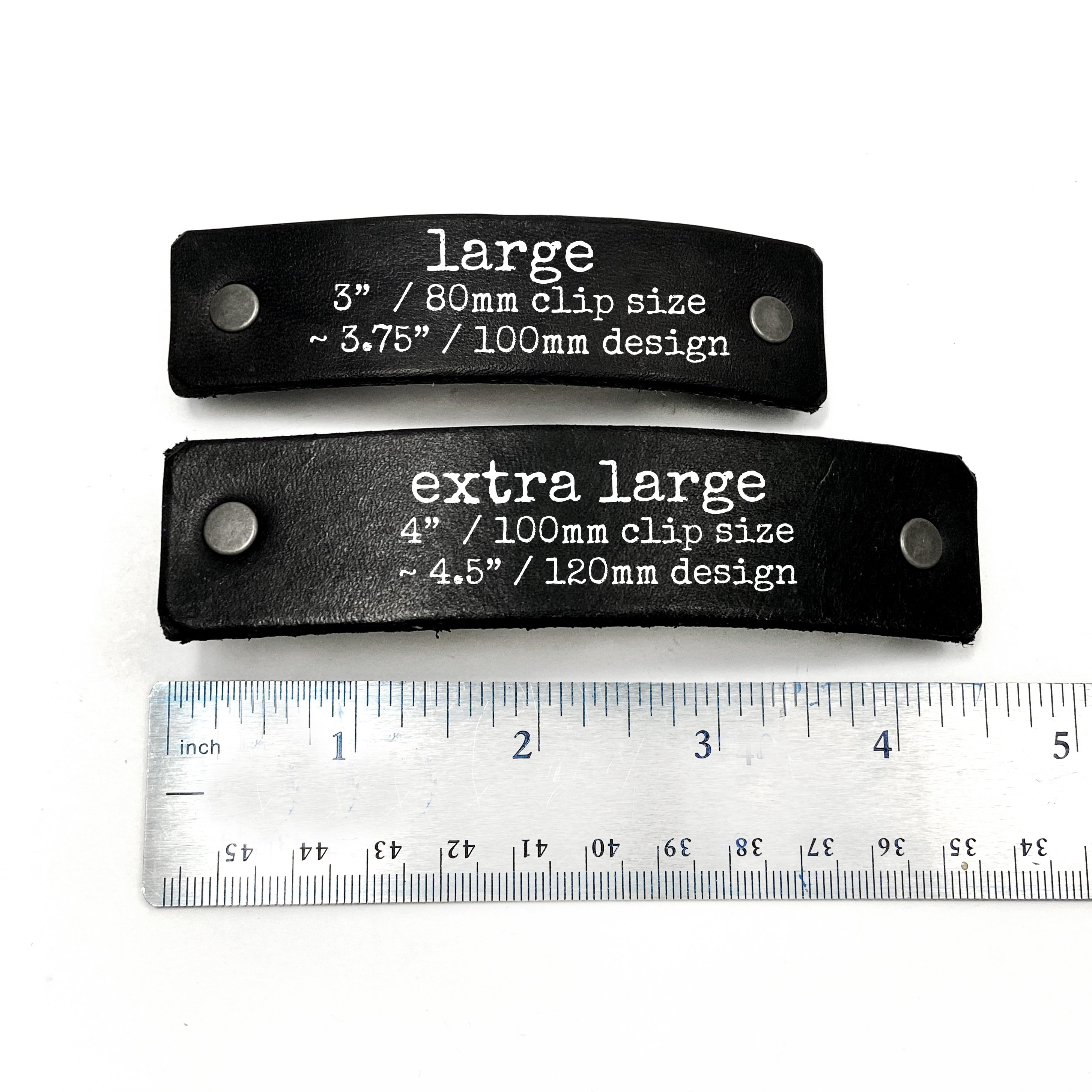 The Shiny Copper Oak Leaf Imprint Leather Hair Barrette is designed specifically for those with long and thick hair. It comes in two sizes: large and extra-large. The large barrette features a 3-inch clip and a leather upper design piece measuring 3.75 inches by 0.75 inches, making it ideal for ponytails and half up-dos. The extra-large option, with a 4-inch clip and a leather piece measuring 4.75 inches by 0.75 inches, is perfect for thick, curly hair or twisted updos. No matter your hair type, this barrette will hold your hair securely in place all day long.