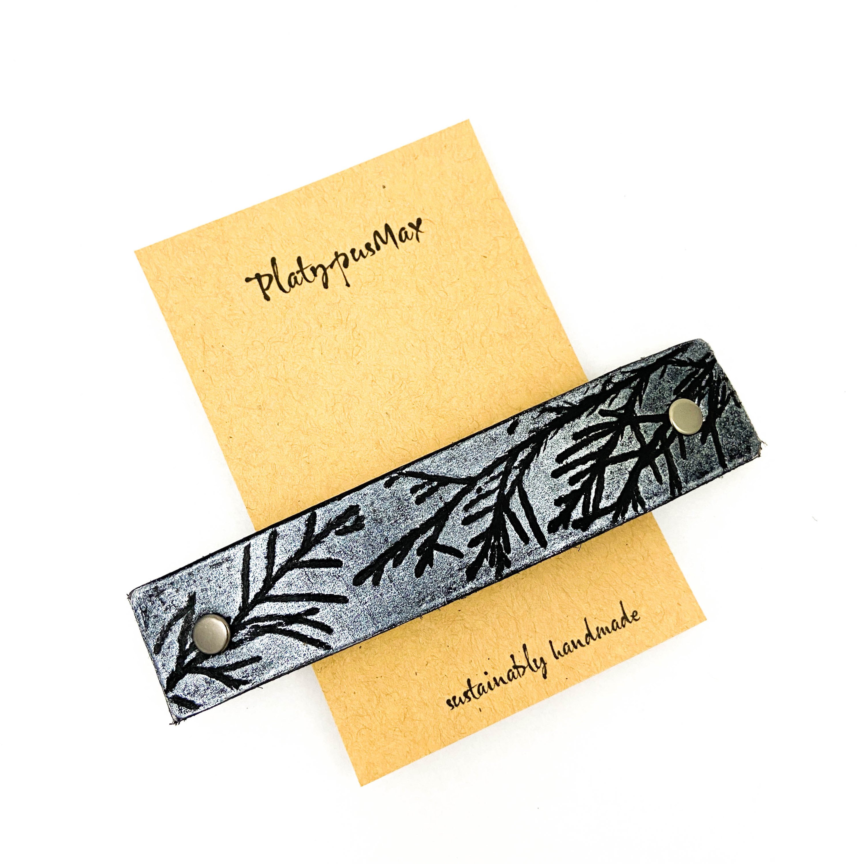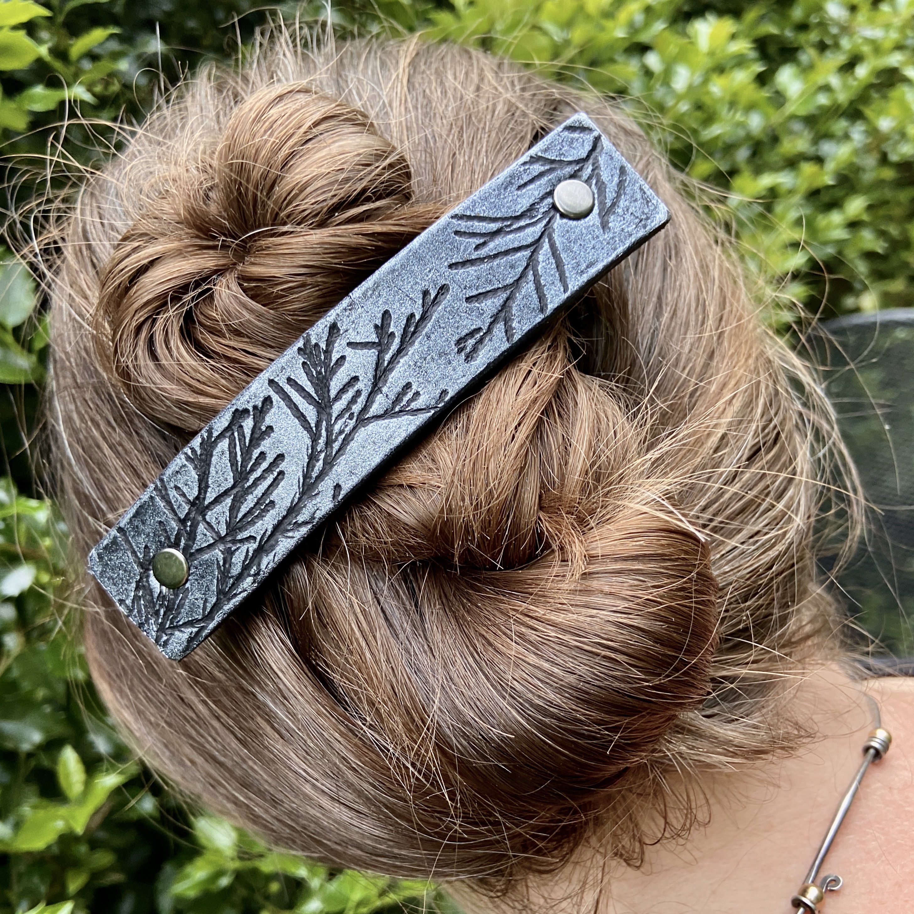 Introducing the exquisite Silver Juniper Branches Leather Hair Barrette, a stunning accessory that combines natural beauty with practical functionality. This hair barrette features embossed juniper branches on high-quality black leather, finished with a light silver tone that adds a touch of elegance without the weight of traditional metal accessories. The unique design incorporates real plants pressed into the leather, creating a beautiful texture that is both eye-catching and versatile.