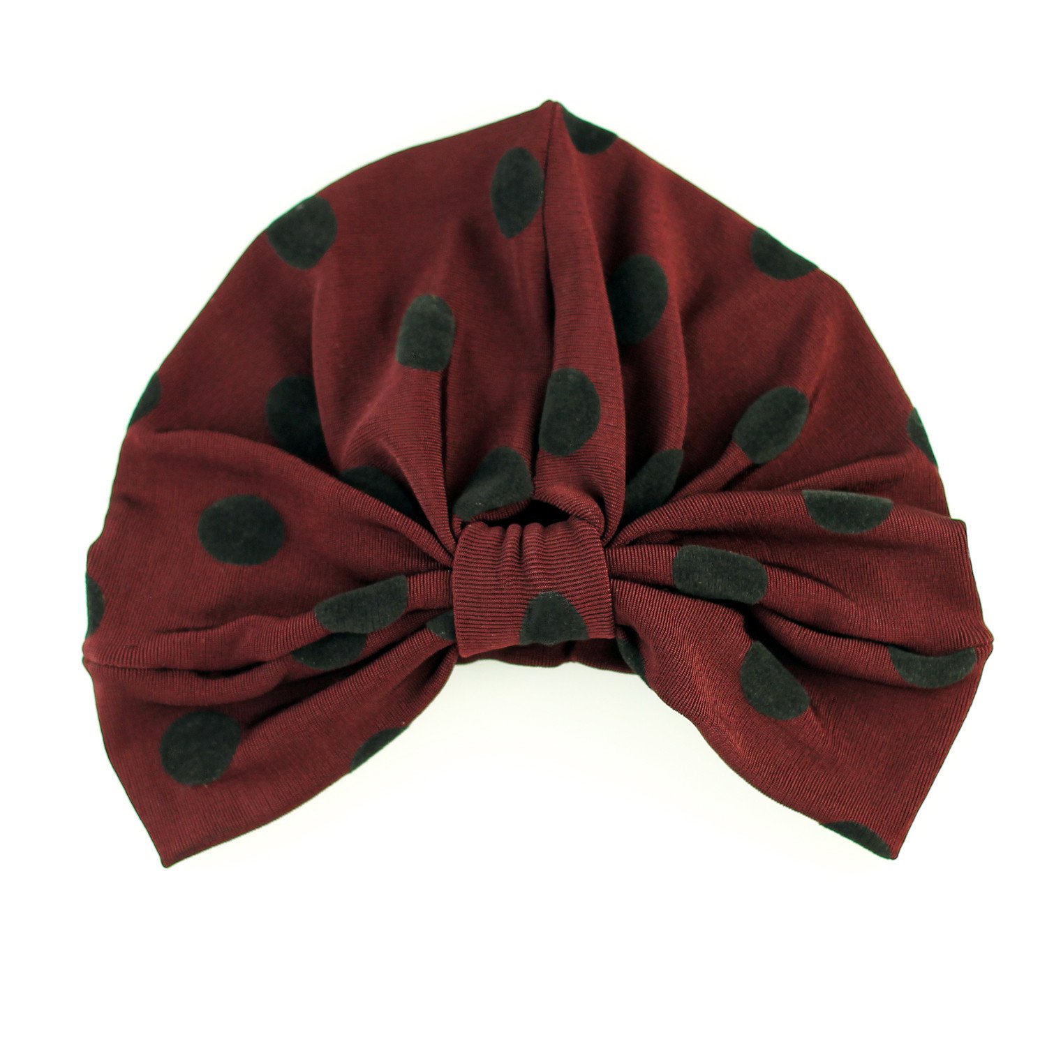 A stylish SLINKY DOT TURBAN featuring black velvet burnout polka dots, designed for comfort with a ruched back, perfect for cool weather.