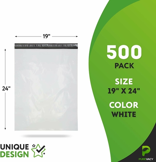 Pack of 500 White Poly Mailers 19” x 24” 2 mil. Strong mailing bags for commercial use and storage purposes. Quantity: 500 Poly Mailers. Useful size: 19x24 inches. White color. Thickness 2 mil.High quality large mailer bags to ensure your packages arrive