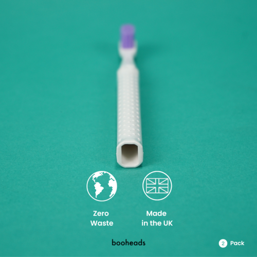 This pack features 2 plant-based booheads toothbrushes in Purple & Aqua.