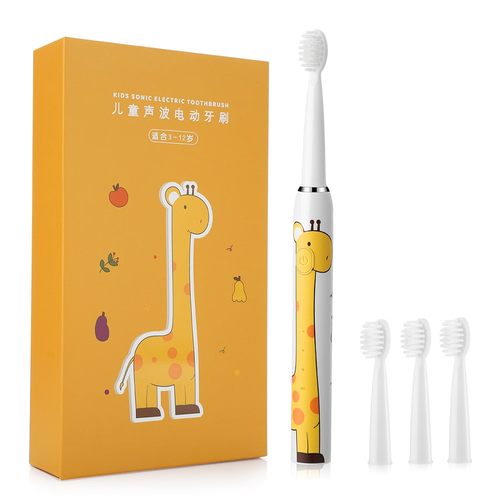 Children's Sonic Electric Toothbrush featuring cute cartoon designs, soft bristles, and a USB charging cable.