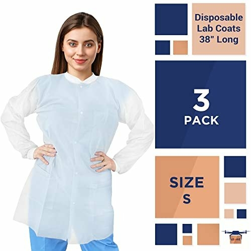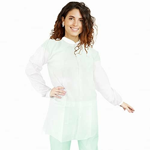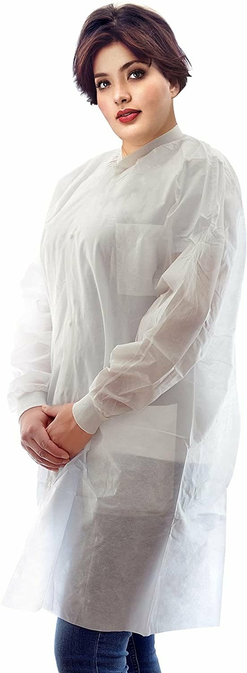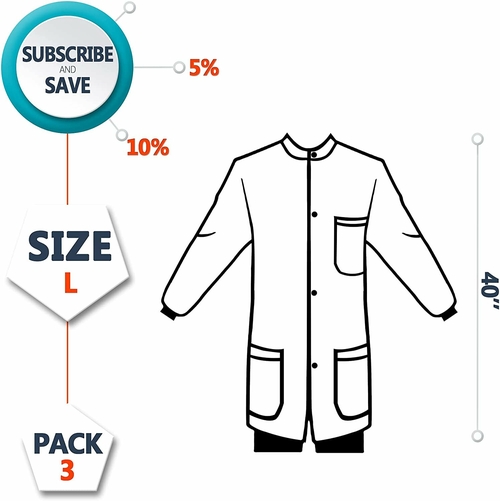 White SMS Lab Coats with Snaps Front, Long Sleeves, Knit Cuffs & Collar, 3 Pockets.