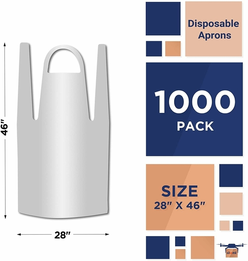 Pack of 1000 Disposable polyethylene aprons are designed to protect against water and other liquids from seeping through to your clothing. One-piece, liquid-proof PE apron resists m