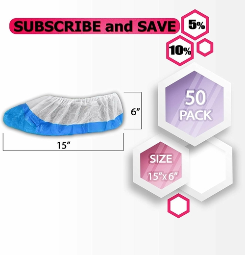 Packaged: Neatly folded and cleanroom packed - 50 pieces per sealed inner polybag.Application: Shoe Cover Color: White with Blue Fastening Type: Elastic Material: Non-woven Polyprolene with a CPE<
