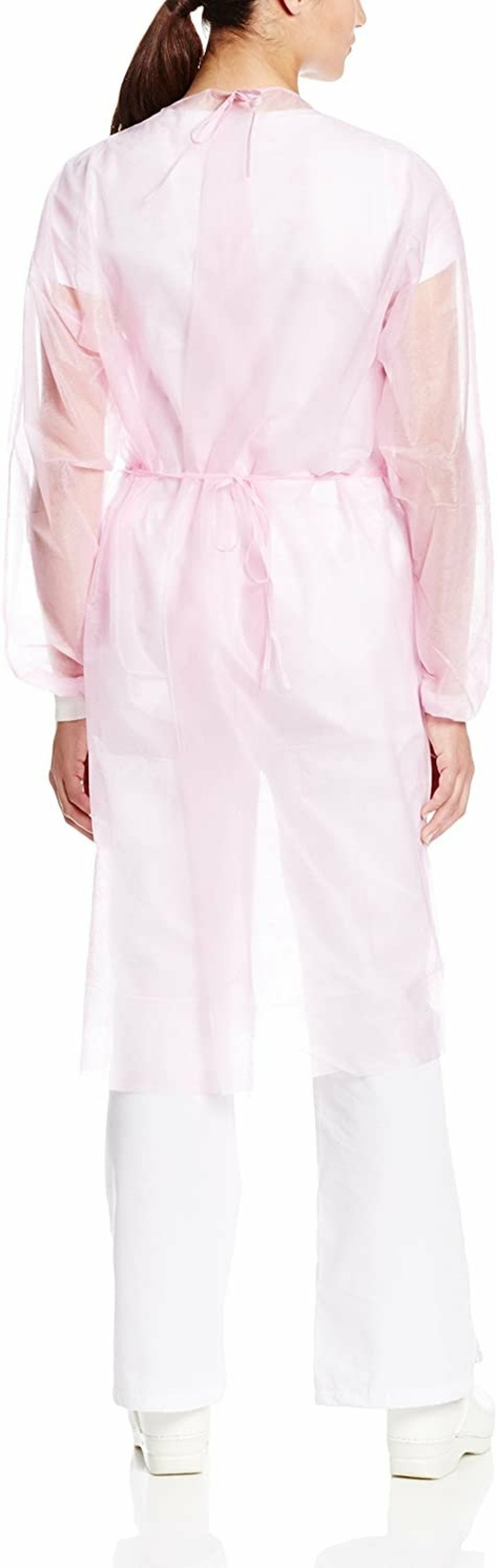 Pink Basic Polypropylene Isolation Gowns with Long Sleeves, Knitted Cuffs and Ties at Back.Size: Regular (chest circumference - 52", overall length - 44")Color: PinkMaterial: PolypropyleneWeight: 25 gsmQuantity: 10 pieces per packNot made with natural rub