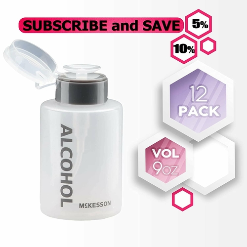 For Use With: Alcohol Size: 4 3/4 inch x 2 1/2 inch Packaged: 1 Per Bag, 12 Bags Per Box, 12 Boxes Per Case Specifications: Push Down Dispensing, 9 Ounce, Translucent, Alcohol Imprint, Polyethylene, Locking