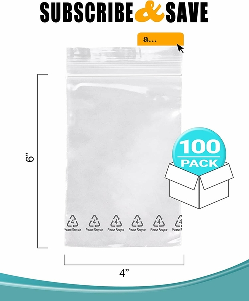 Pack of 100 Clear Zipper Bags with Recycle Logo 4 x 6. Polyethylene