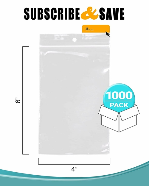Pack of 1000 Polypropylene Bags With Hang Hole, 4 x 6. Clear Plastic