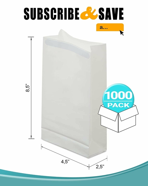 Dimensions: 4.5 inch x 2.5 inch x 8.5 inch Gauge: 3 mil Color: White Closure: adhesive tape High Density Polyethylene material is thinner, stronger and less transparent than LDPE. HDPE is used in bags design
