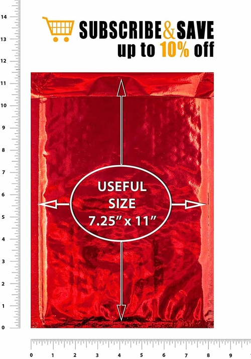 GLAMOUR RED BUBBLE MAILERS with Peel and Seal. MIRRORED METALLIC FOIL Boutique versicolor envelopes. Laminated Metalized Foil. Useful space 7.25 " x 11". Outside size 8.25" x 11.5". Manufacturer size tolerance +/- 25". PACK of 25 red mailing bags. .. HATE