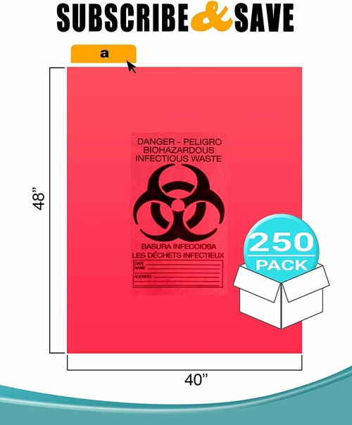 Material: HDPE Color: red Dimension: 40 inch x 48 inch Gauge: 16 micron Quantity: 250 Liners, 25 Liners/Roll, 10 Rolls/Box. Disposal plastic bags are used for storage and transport packaging