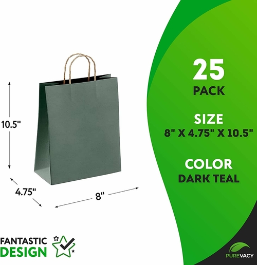 PUREVACY Dark Teal Kraft Paper Bags 8" x 4.75" x 10.5". Pack of 25