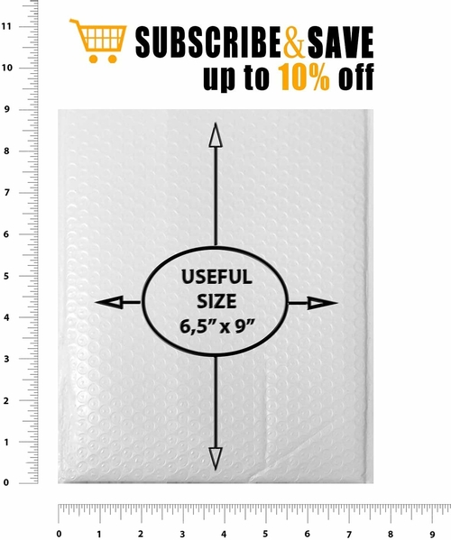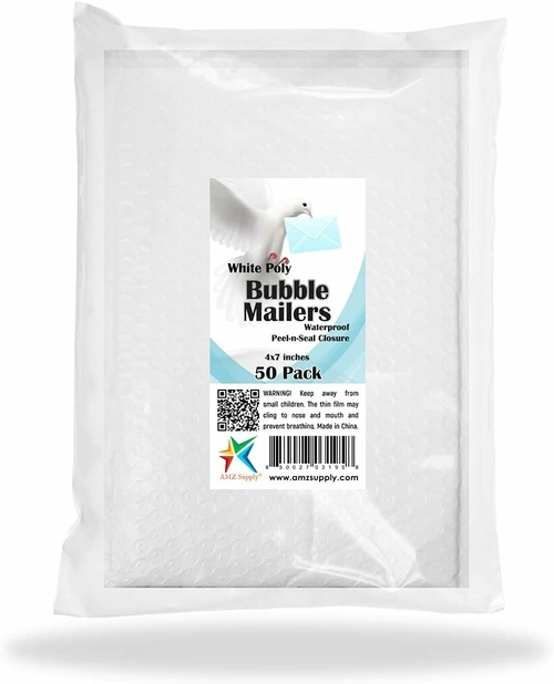 WHITE POLY BUBBLE ENVELOPES with Peel and Seal. PACK of 50 plastic padded mailers. Useful space 6.5" x 9". Manufacturer size tolerance +/- 25". Highest quality, structurally sound materials to provide both visual enhancement and security. Pad mailing bags