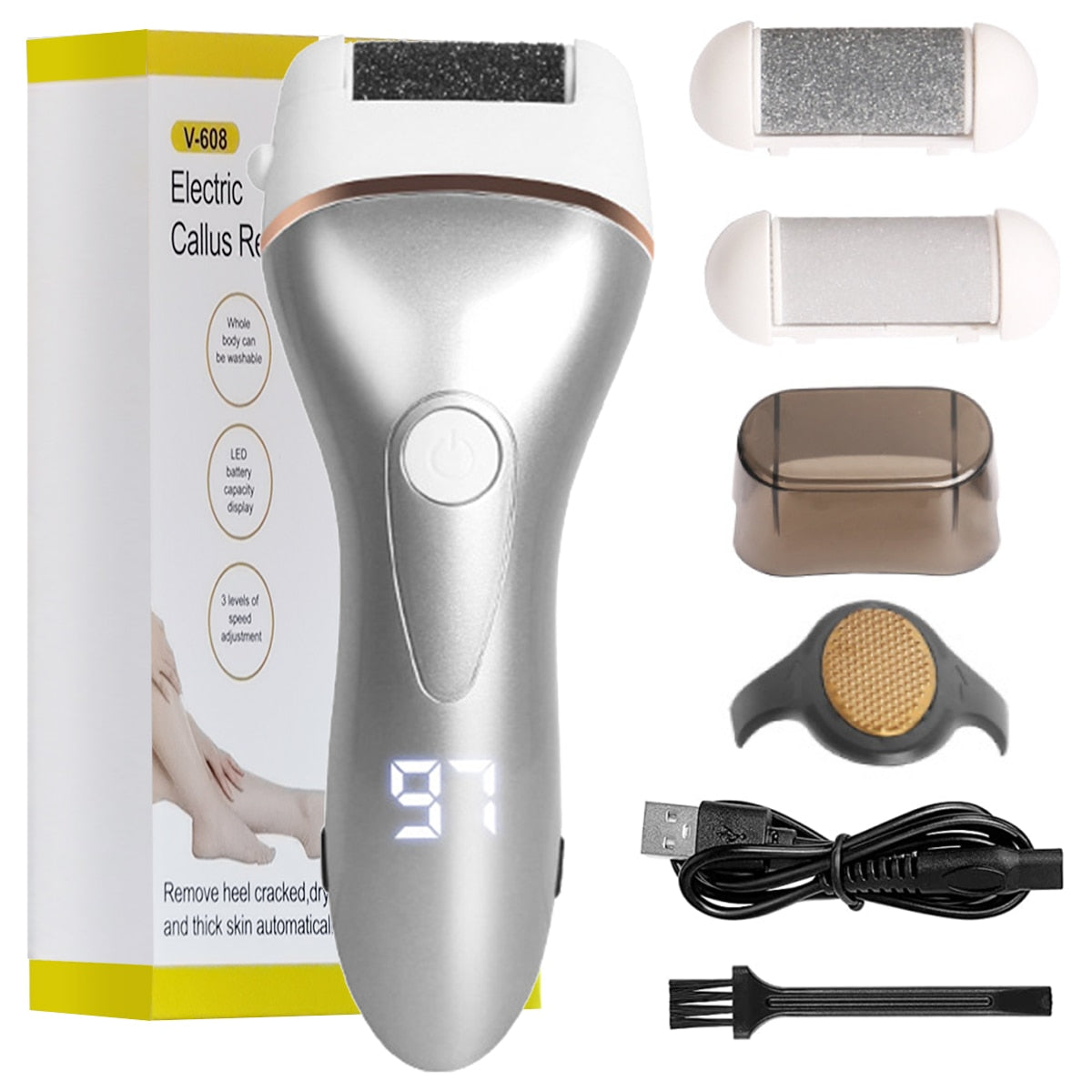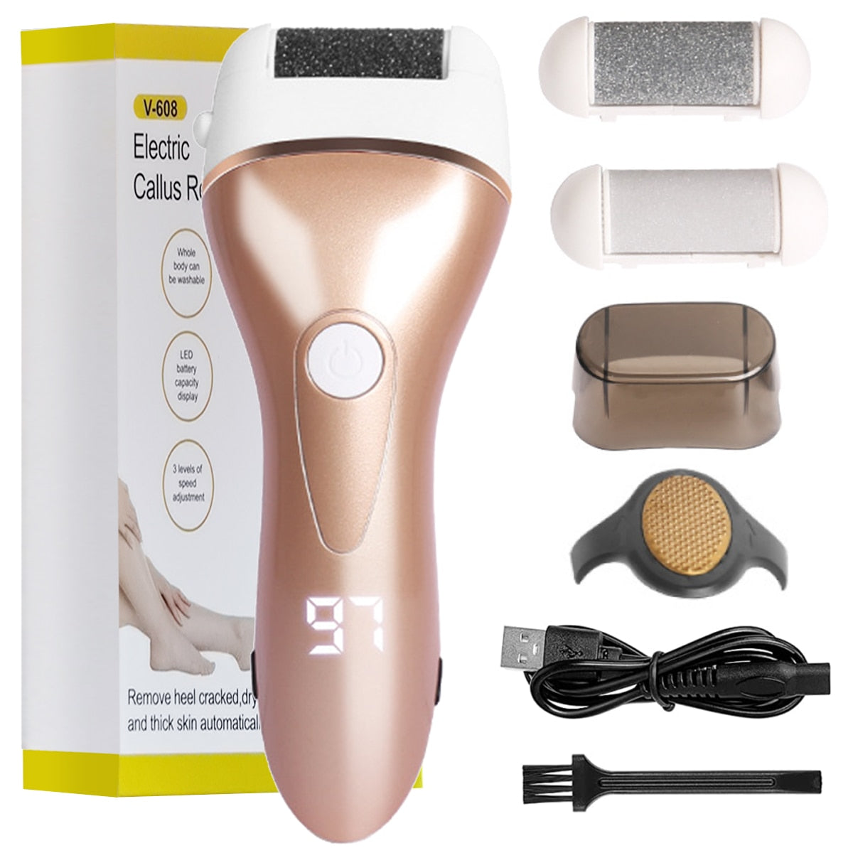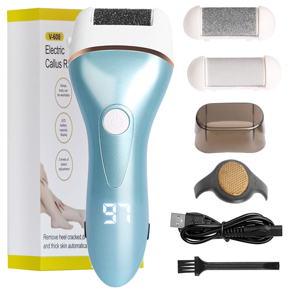 The Electric Foot File for Heels is the ultimate solution for achieving smooth, beautiful feet effortlessly. Designed with convenience and efficiency in mind, this innovative pedicure tool features three interchangeable roller heads and three adjustable speeds, allowing you to customize your foot care routine based on your specific needs. Whether you have delicate skin or tough calluses, this electric foot file can handle it all, ensuring your feet look and feel their best.