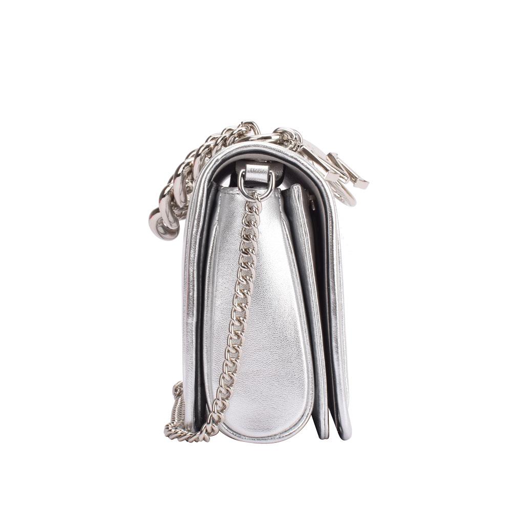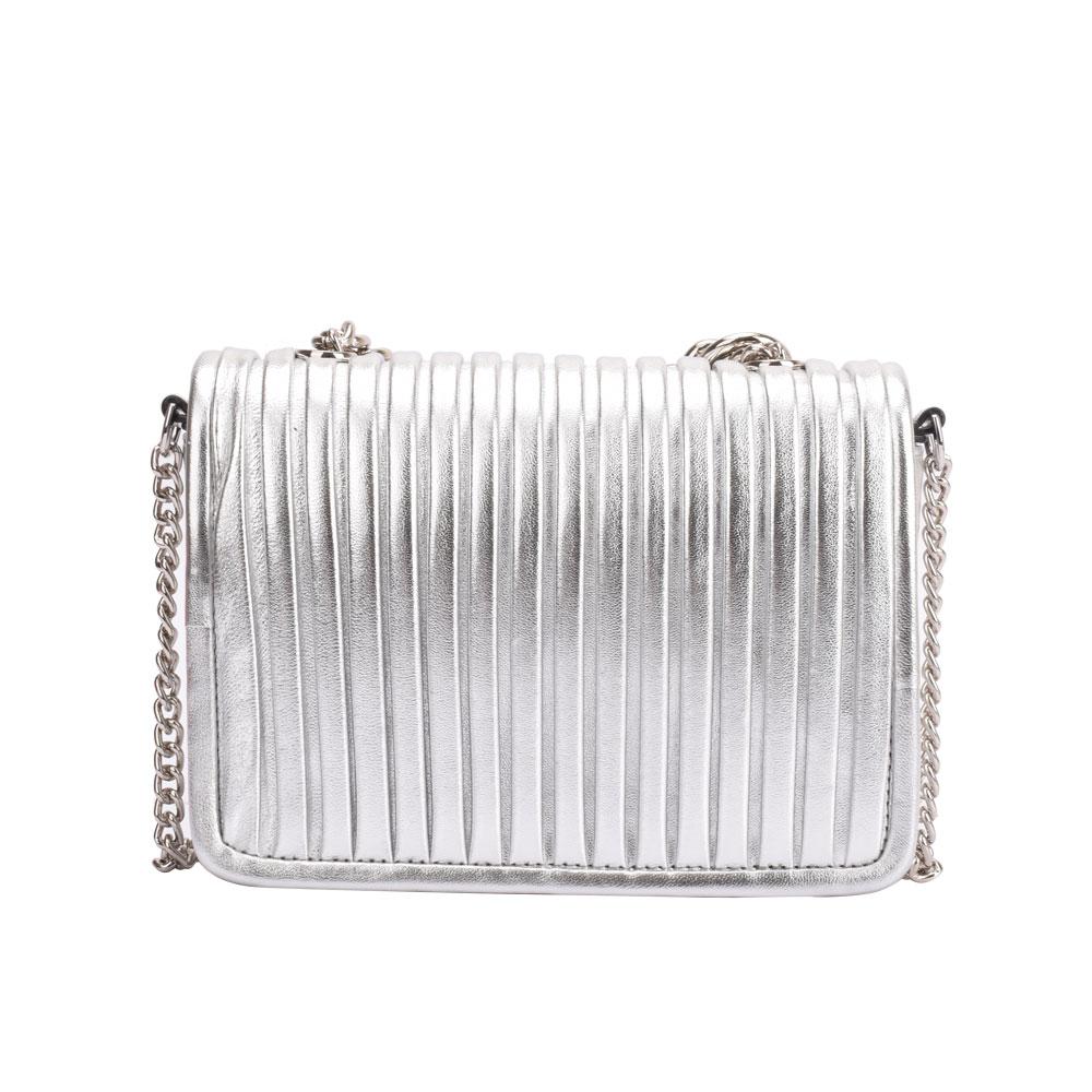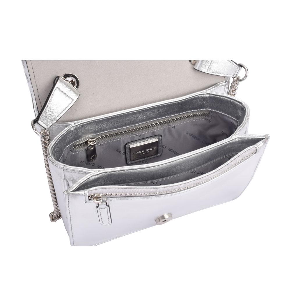 Maria Carla Women's Luxury Leather Handbag in silver, featuring smooth pleated lamb leather and a stylish silver chain handle.