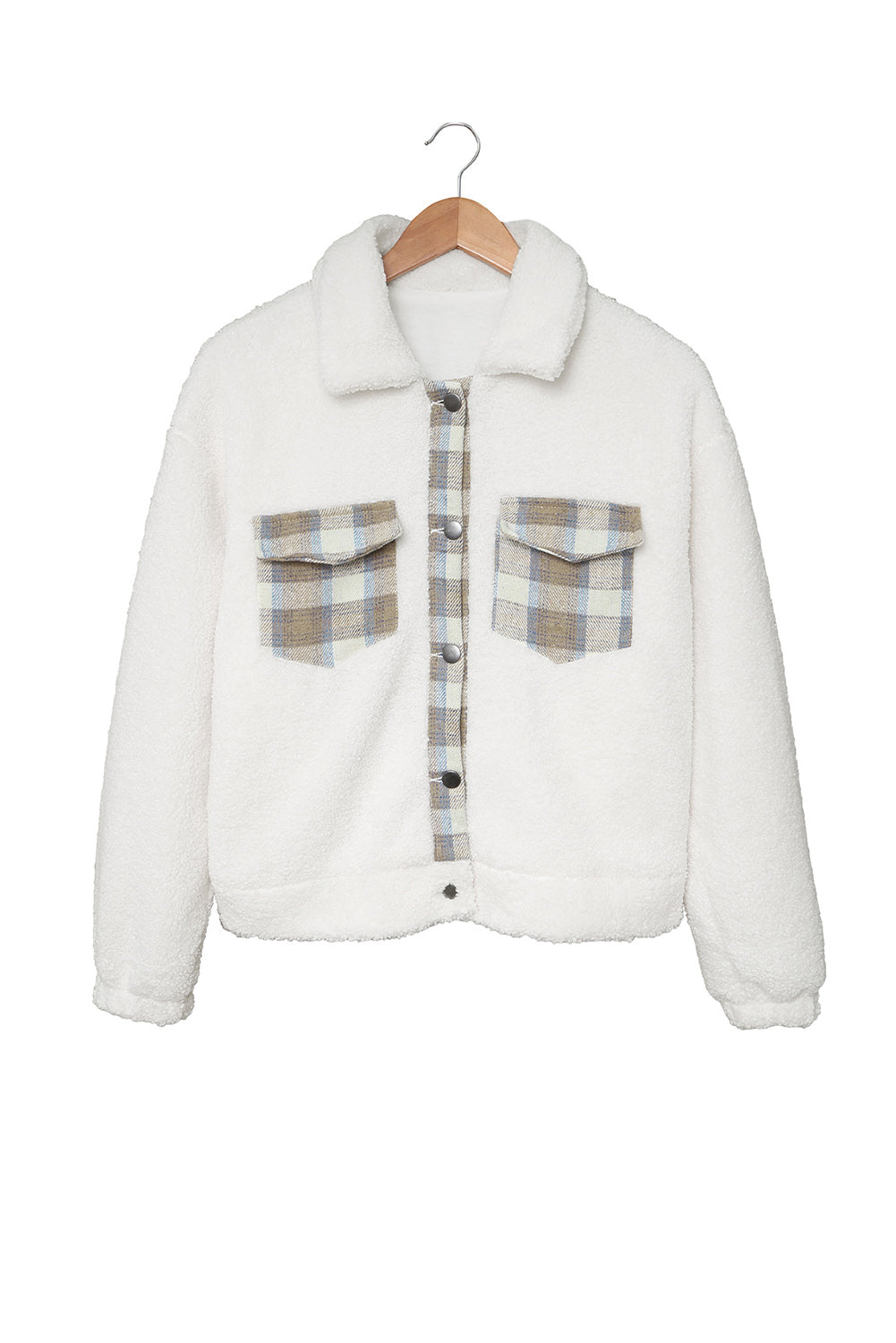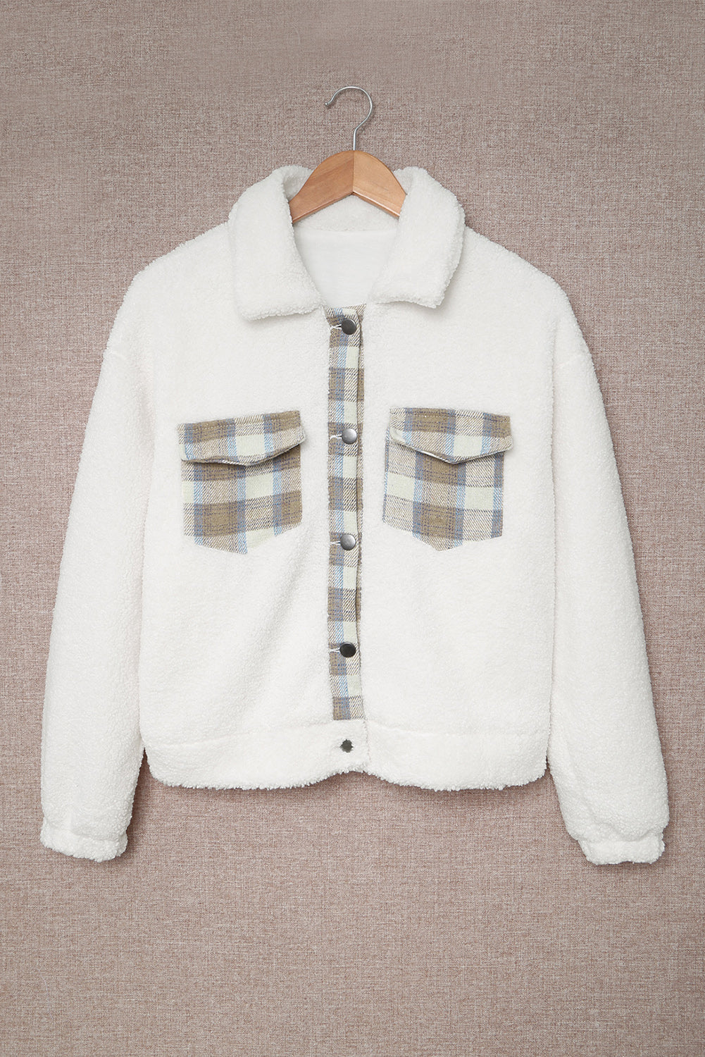 Introducing the Beige Plaid Patchwork Buttoned Fleece Turn Down Collar Jacket, a perfect blend of style and comfort. This jacket is designed to keep you warm while ensuring you look fashionable. The unique plaid patchwork design makes it a standout piece in any wardrobe, allowing you to express your personal style effortlessly.