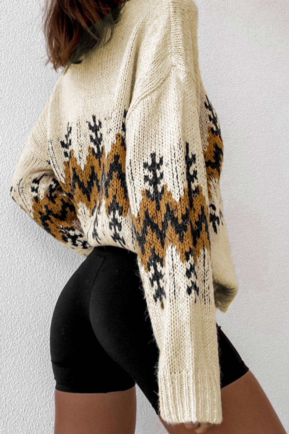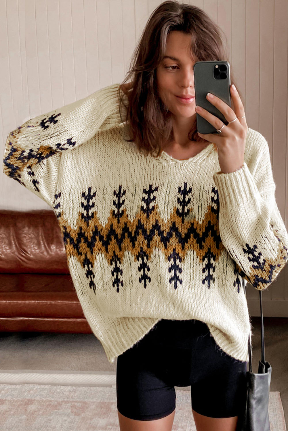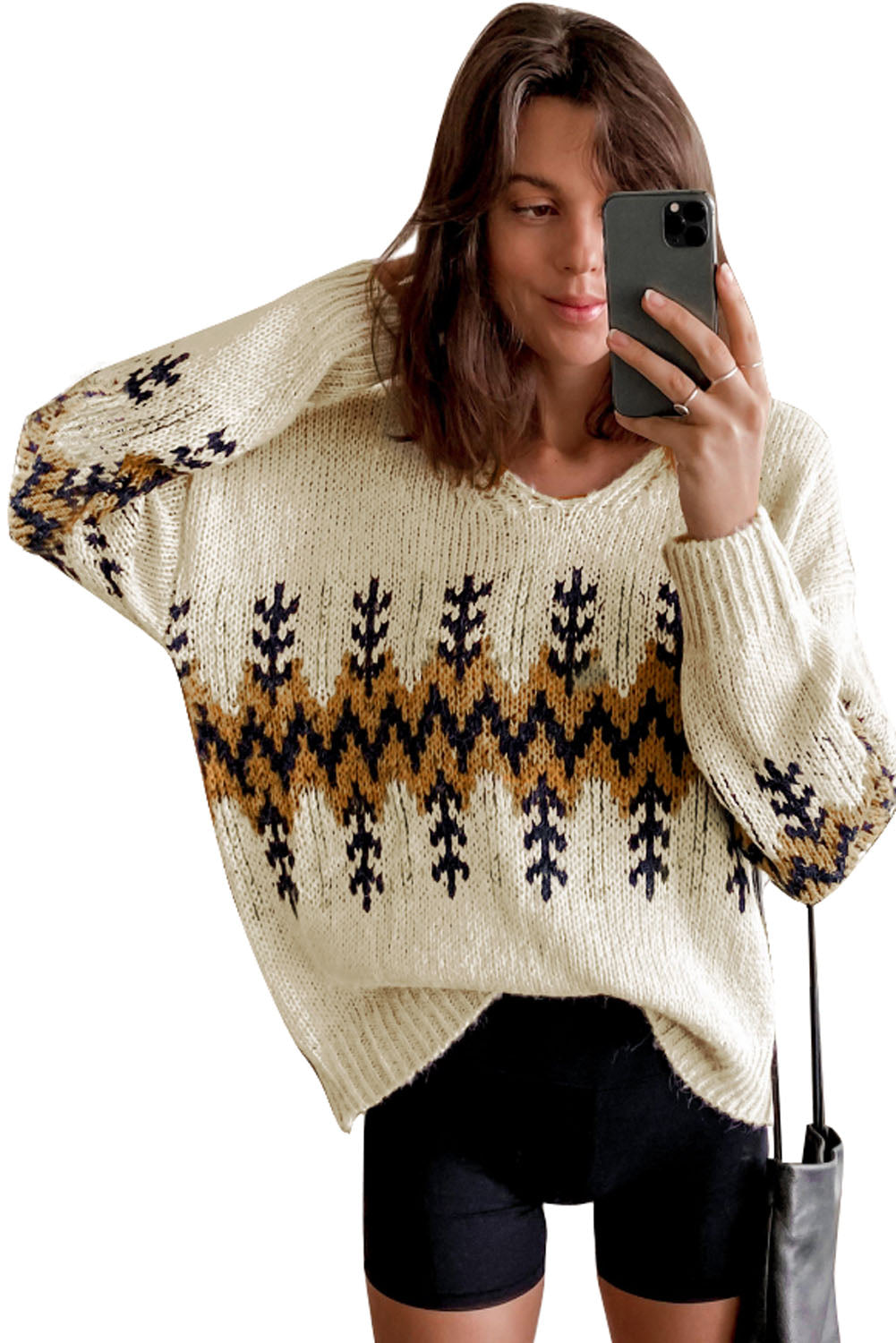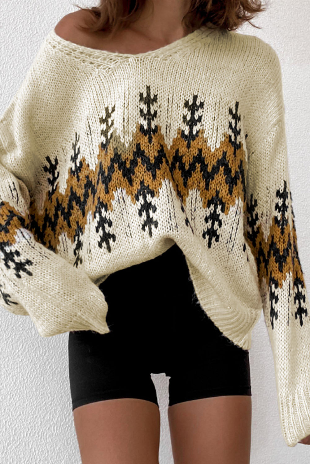 Celebrate the holiday season in style with our Beige Slouchy Fit Christmas Tree Print V Neck Knit Sweater. It's the perfect blend of comfort, style, and festive cheer!