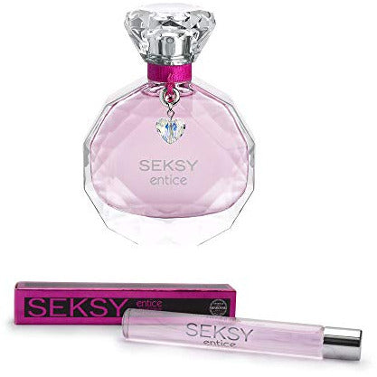 A sleek and elegant bottle of Seksy Entice Eau de Parfum, showcasing its sophisticated design and luxurious appeal.