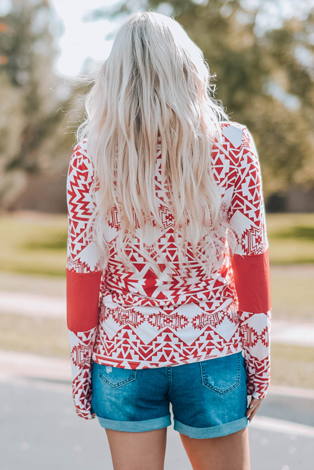 Fiery Red Aztec Print Splicing Pocket Long Sleeve Top featuring a unique design and comfortable fit, perfect for casual and stylish outfits.
