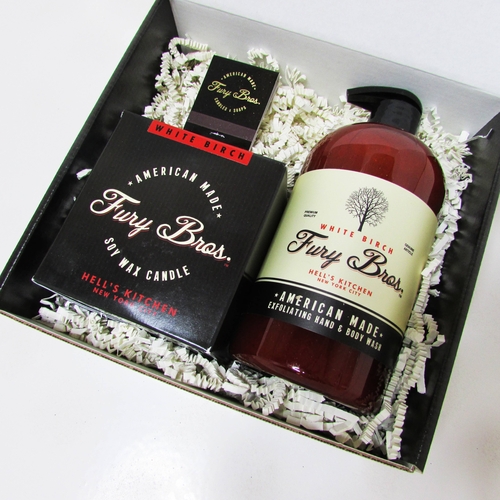 Each box contains (1) Black Series Five Spice Candle 9 oz., (1) Black Series Five Spice Exfoliating Hand & Body Wash 16 oz., (1) Fury Bros. book of matches.