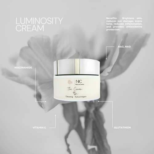 NatureCastle’s Luminosity Cream is a powerful blend of ingredients designed to brighten and protect your skin. Infused with Niacinamide and Vitamin C, this cream effectively reduces sun damage and evens out skin tone, leaving your complexion radiant and smooth. NAC and NAG provide additional brightening effects and enhance skin barrier function, while Glutathion and Kombuchka offer potent antioxidant protection against environmental pollutants. Kaempferol, White Peony, and Japanese Plum (Ume) work together to reduce inflammation and irritation, promoting a calm and even complexion. Argan and Prickly Pear oils nourish and hydrate the skin, ensuring it remains supple and resilient. Perfect for daily use, our Luminosity Cream transforms your skincare routine, delivering a luminous, healthy glow.