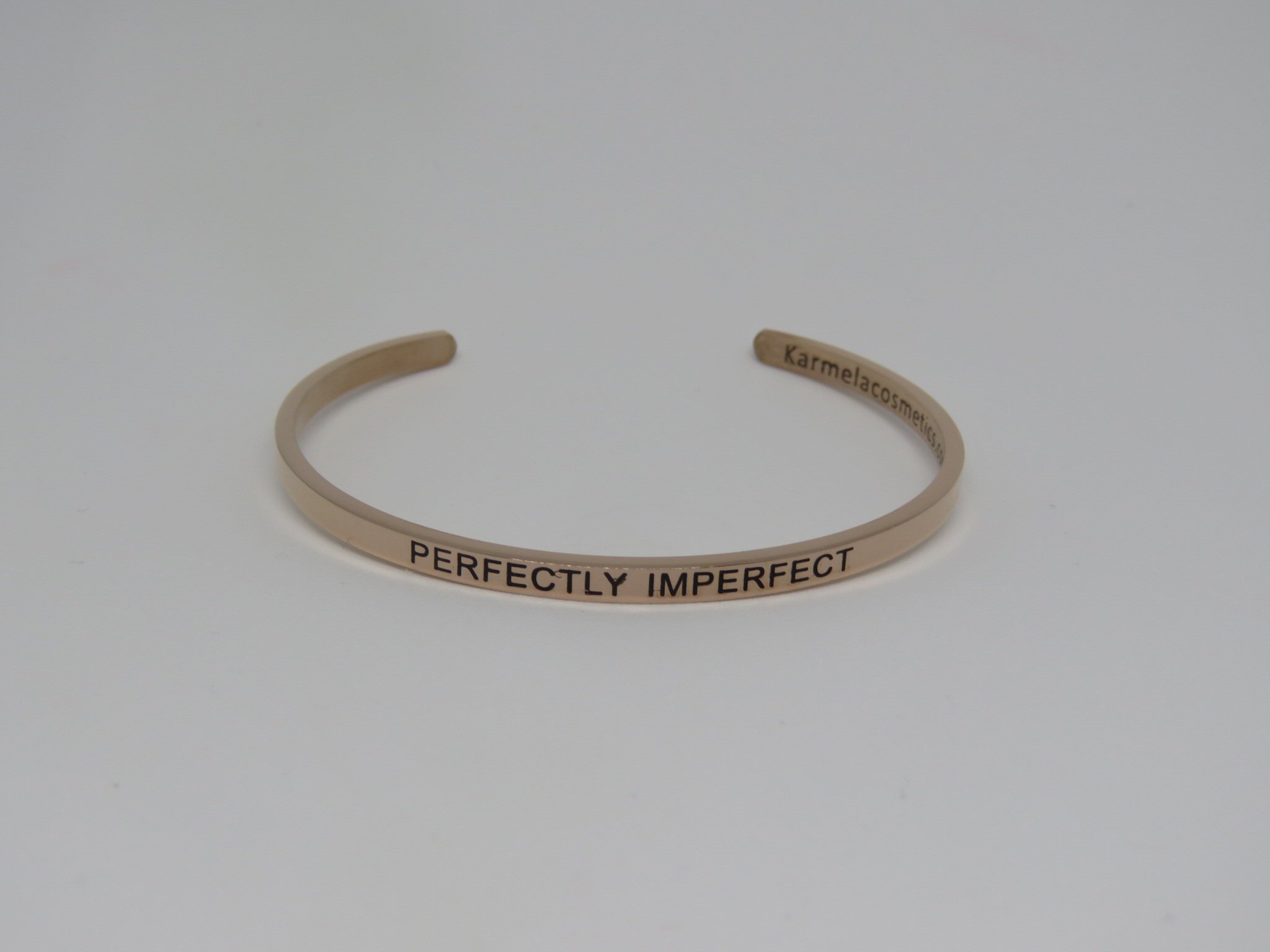 Elegant rose gold bangle with the mantra 'Perfectly Imperfect', symbolizing empowerment and individuality.