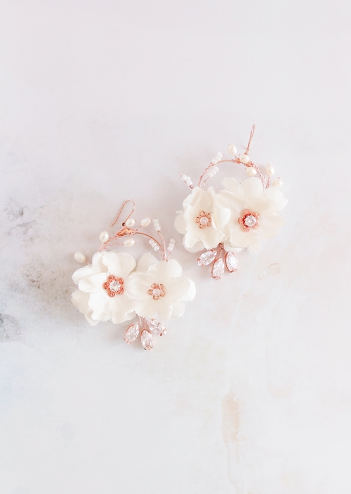 Bridal hoop earrings made with handcrafted sterling silver erring hooks, natural silk flowers, silver-plated wiring, plated metal findings, freshwater pearls, and cubic zirconia crystals.