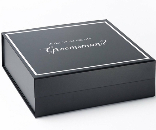 Make your groomsman feel special with the exquisite 'Will You Be My Groomsman?' proposal box. This elegant black box features stunning metallic writing on the lid, making it a perfect way to pop the question to your closest friends. The sleek design and high-quality materials ensure that this gift box stands out, creating a memorable moment for your groomsman.