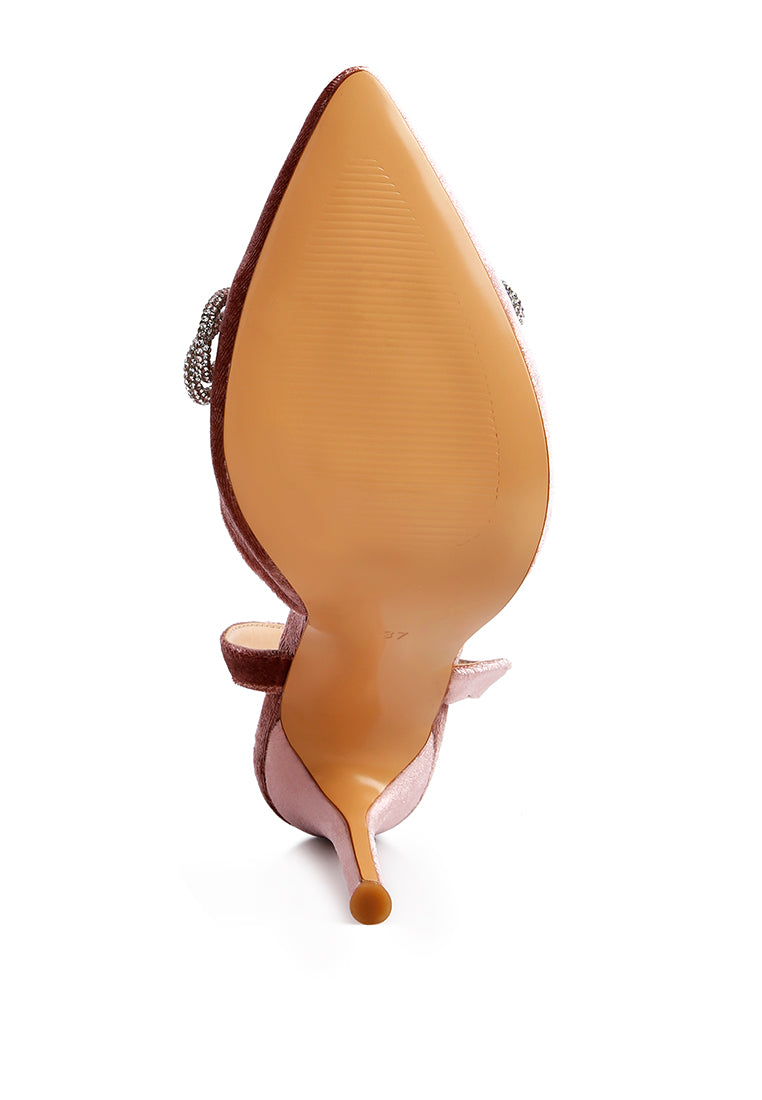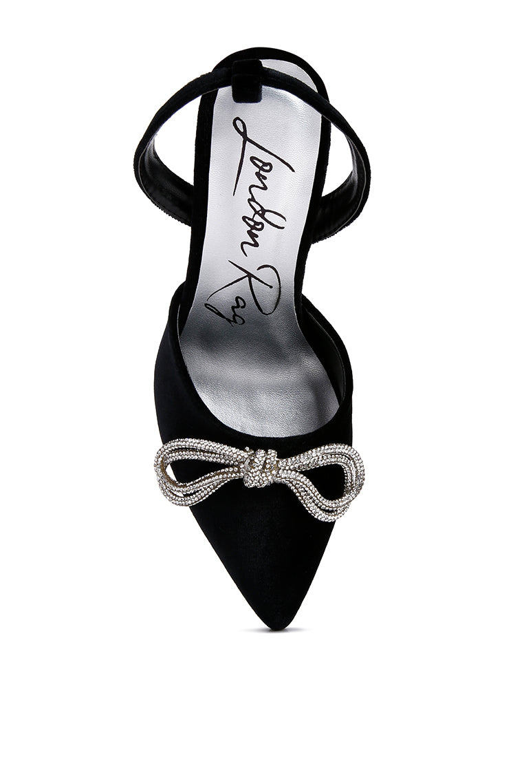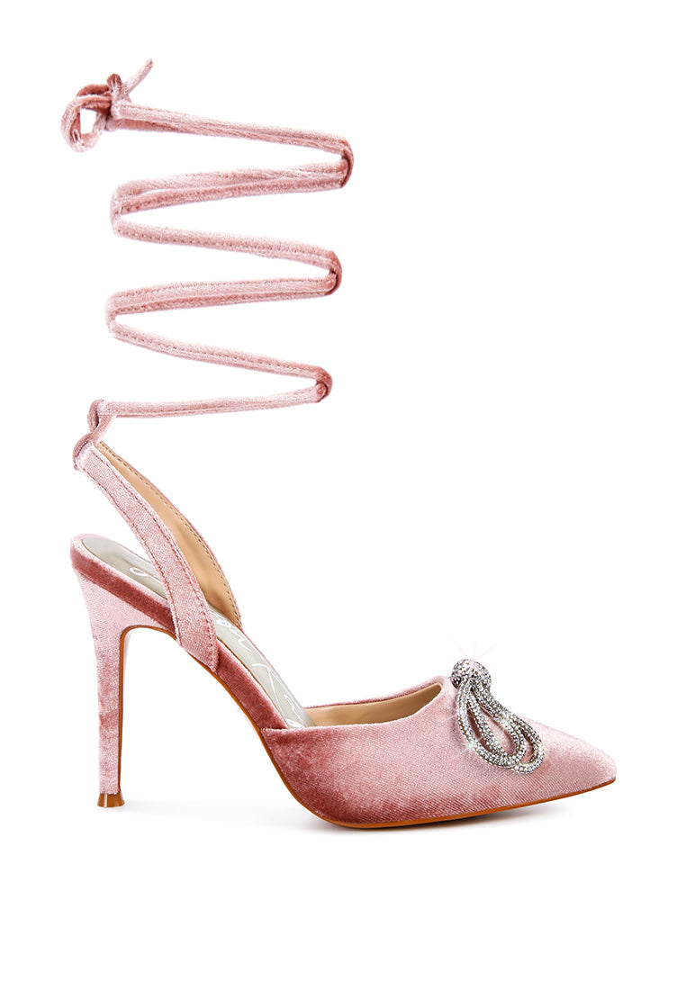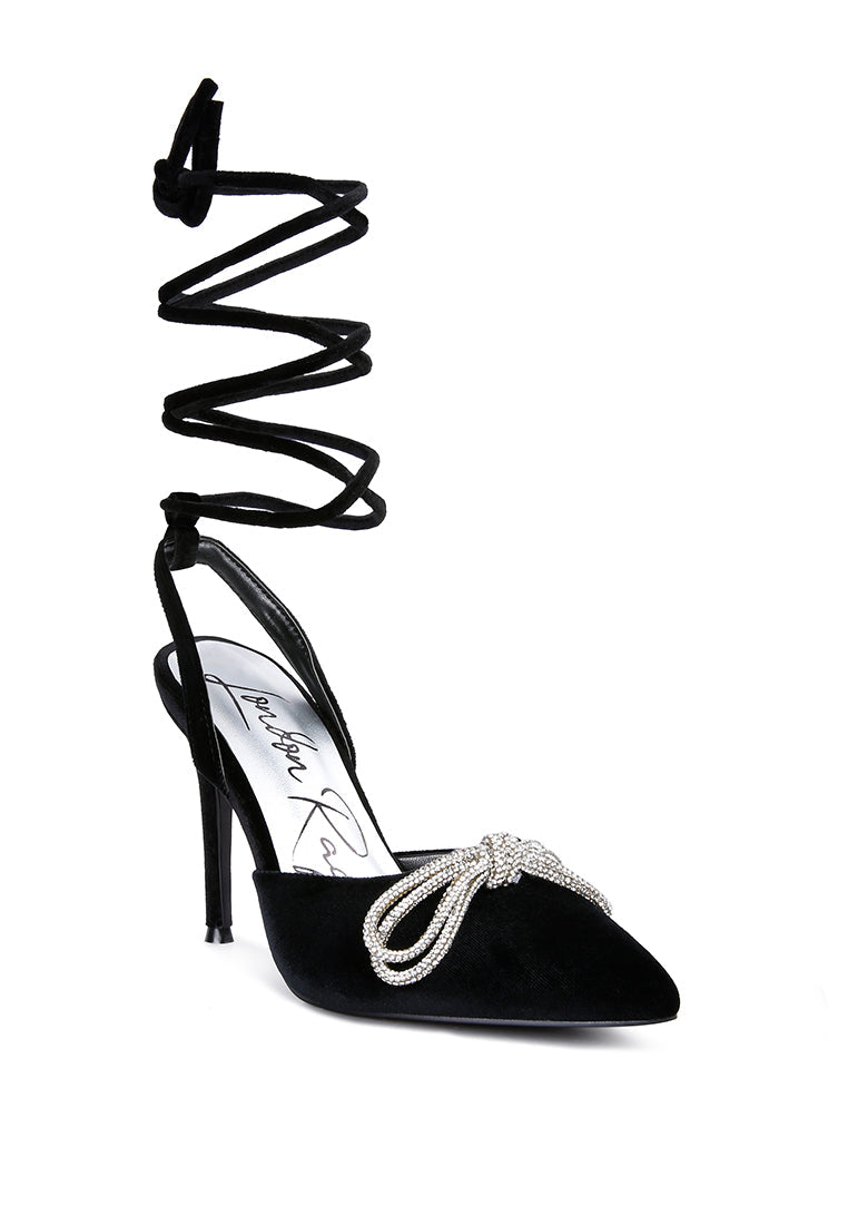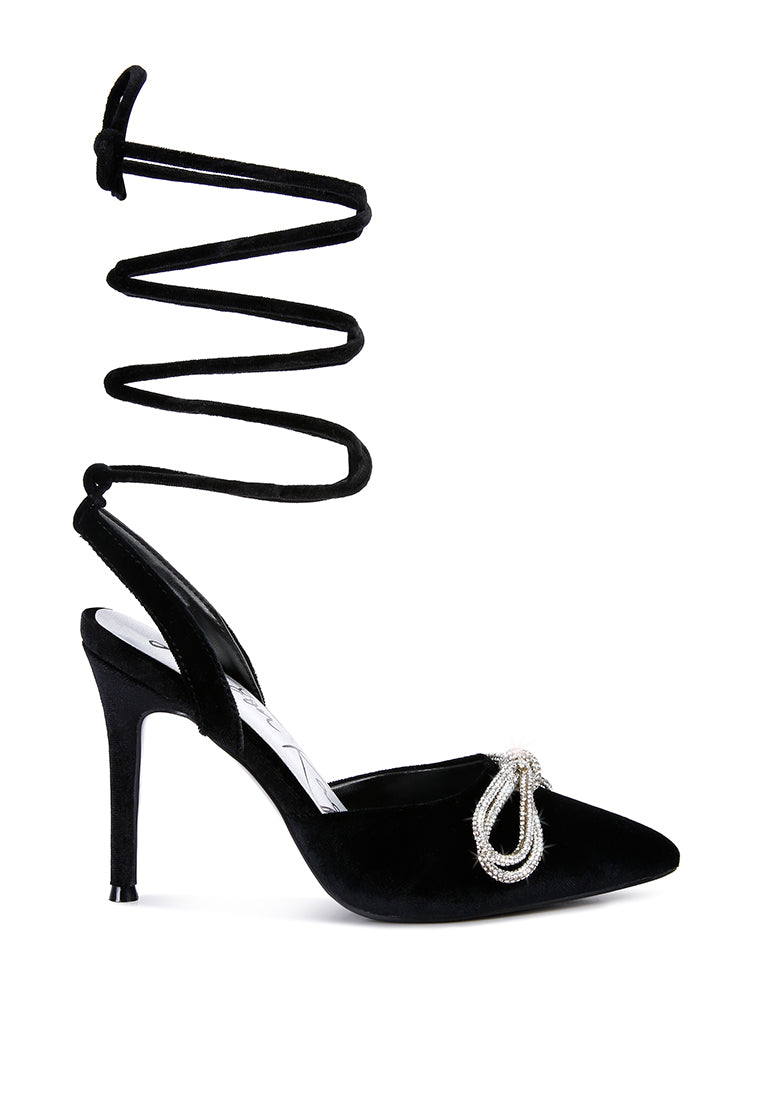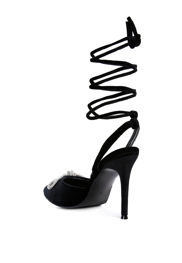 Introducing the Big Treat Rhinestone Embellished Lace Up Sandals, a stunning addition to your footwear collection. These sandals are designed to make a statement, featuring a beautiful rhinestone embellished bow that adds a touch of glamour to any outfit. The luxurious velvet sheen of the sandals not only enhances their aesthetic appeal but also provides a soft and comfortable fit.