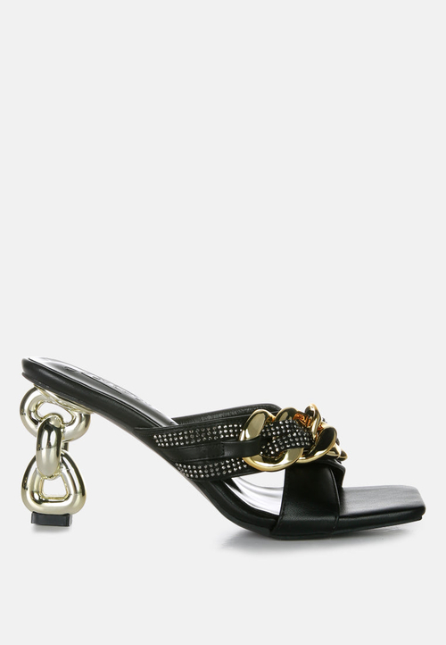 Whether you're dressing up for a special event or looking for a stylish addition to your everyday wardrobe, these sandals are the perfect choice. The combination of diamante and golden metal chain details adds a luxurious touch that will surely turn heads. They are not just sandals; they are a statement piece that reflects your unique style.