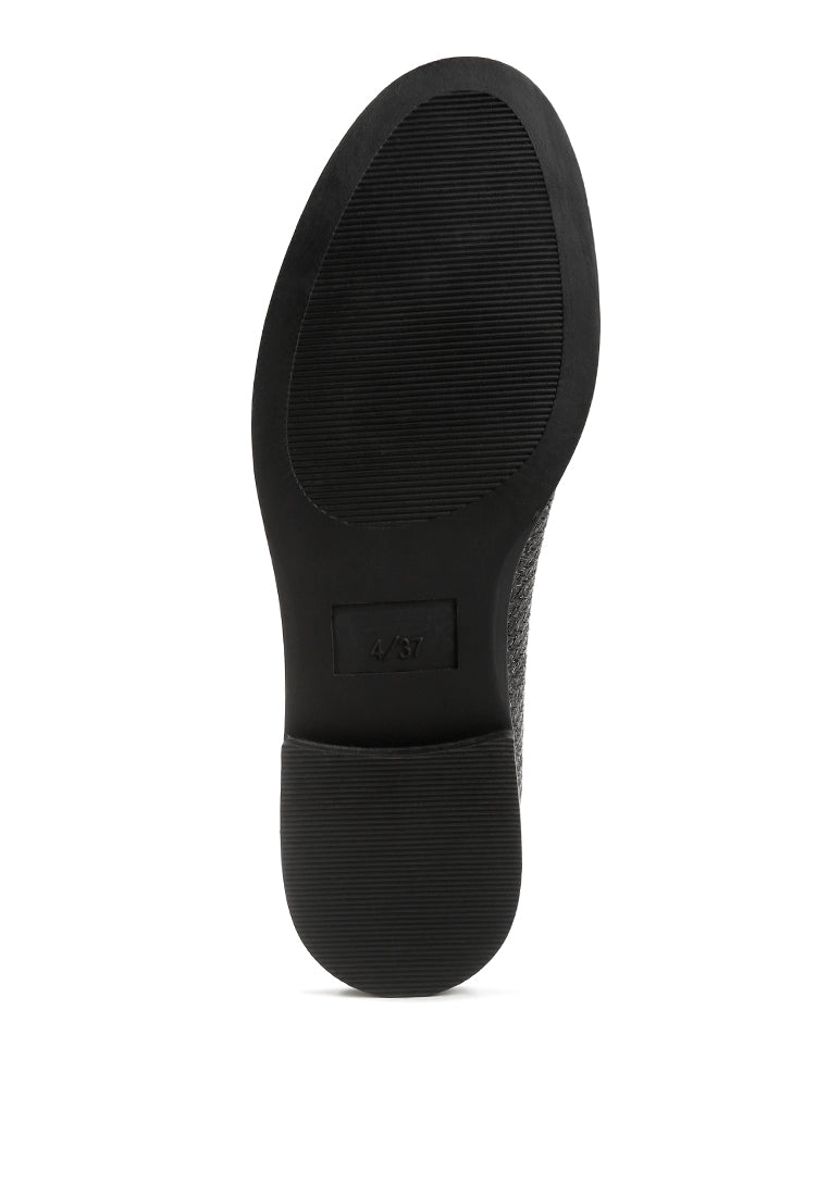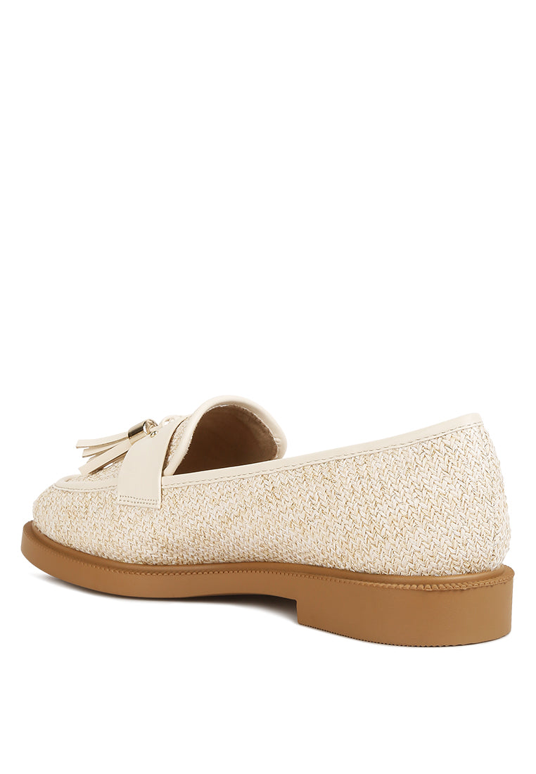 Crafted from high-quality PU and raffia, these loafers are designed to withstand the rigors of daily wear while maintaining their stylish appearance. The faux leather detail not only adds a luxurious touch but also ensures durability. The stitched faux leather lining on the tongue provides additional comfort, making these loafers a practical choice for all-day wear.