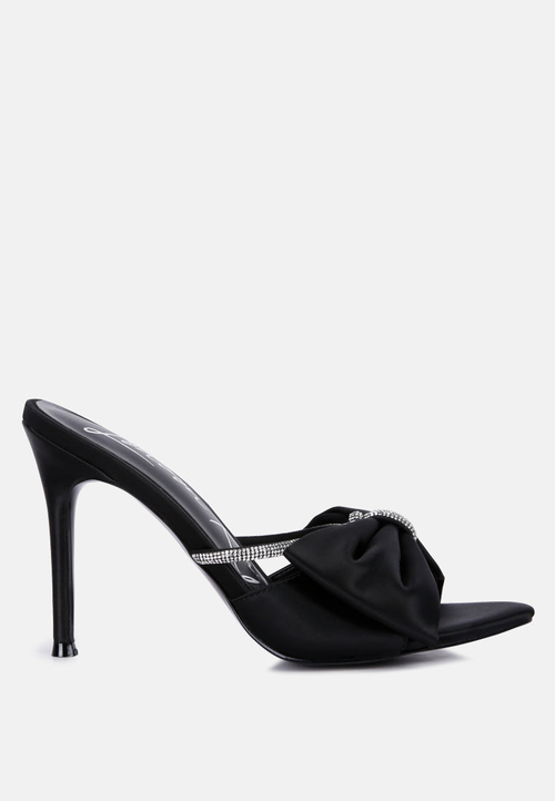 To keep your High Tea Rhinestone Bow Embellished Stiletto Sandals looking their best, it is recommended to clean them gently with a soft cloth. Avoid exposure to excessive moisture and store them in a cool, dry place to maintain their quality.