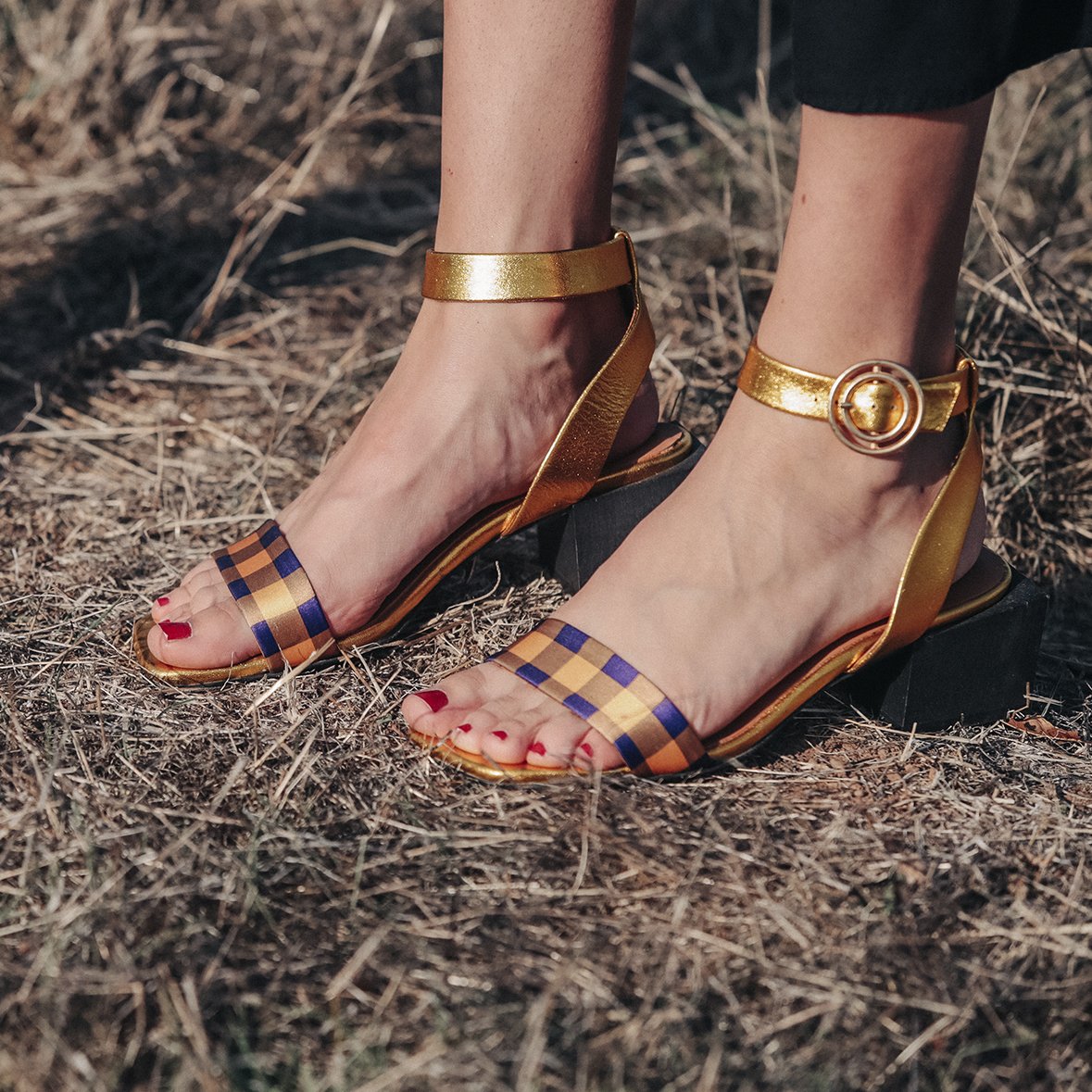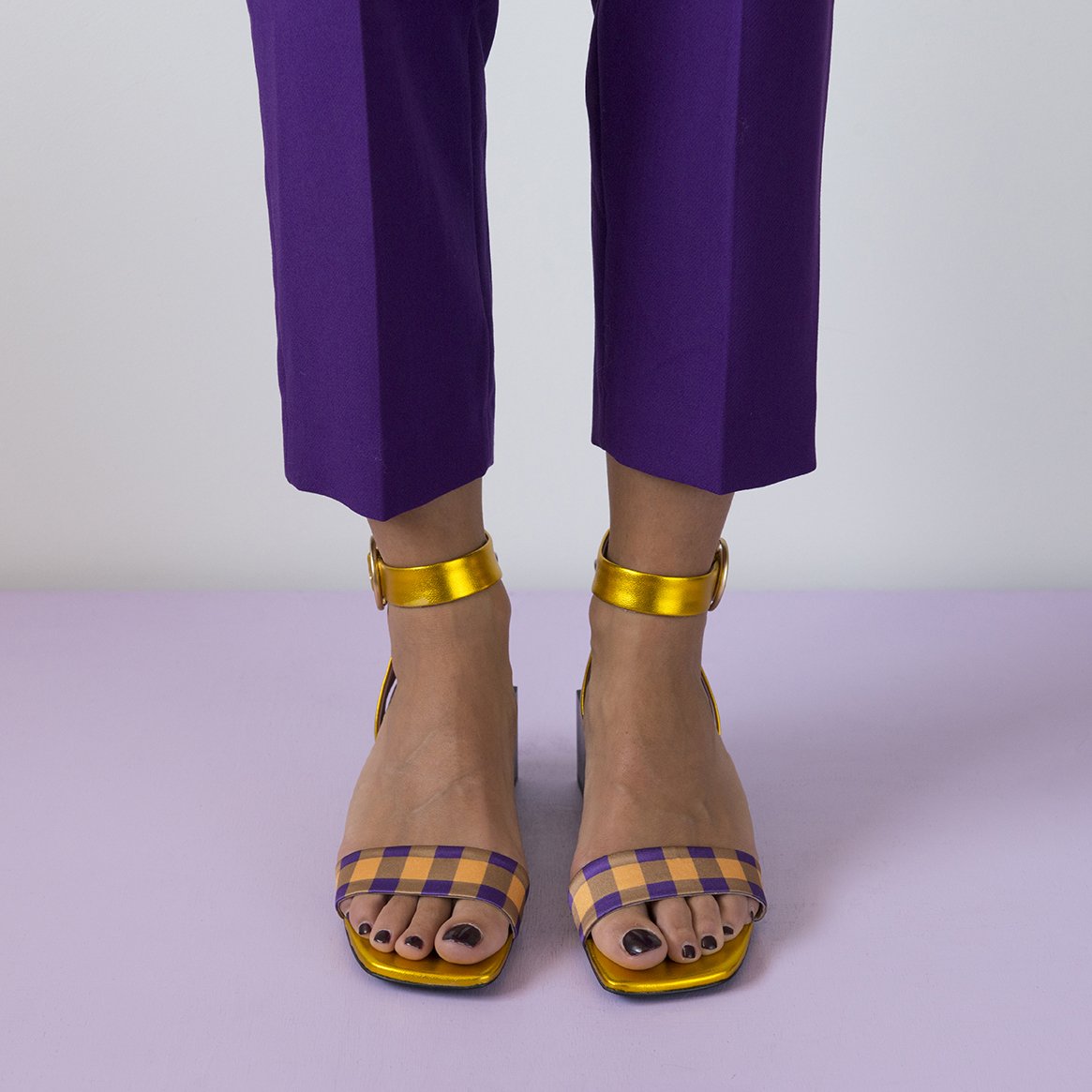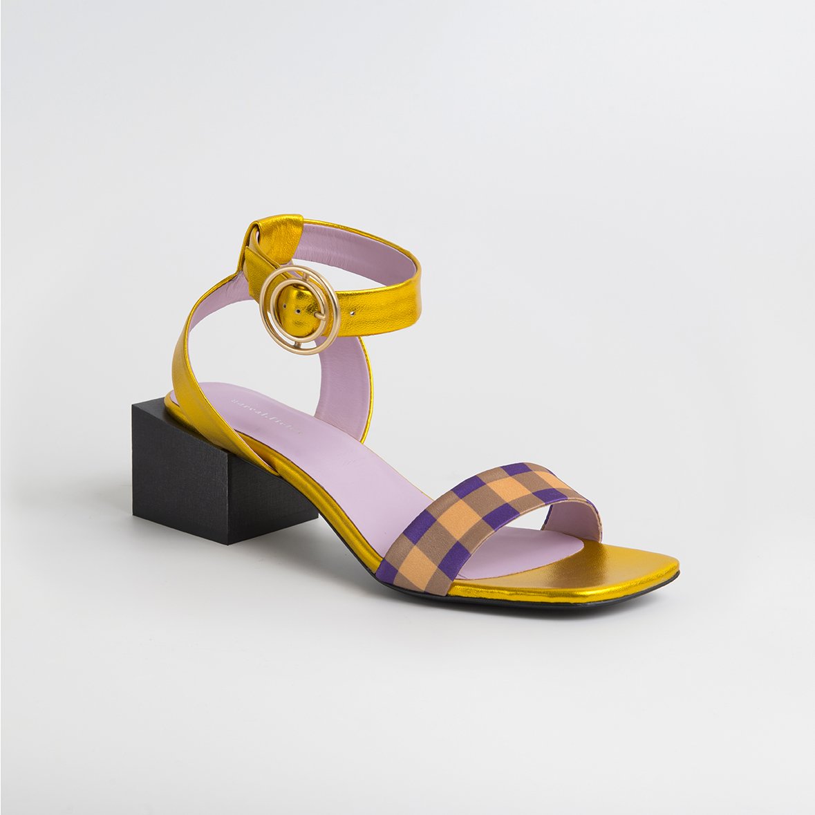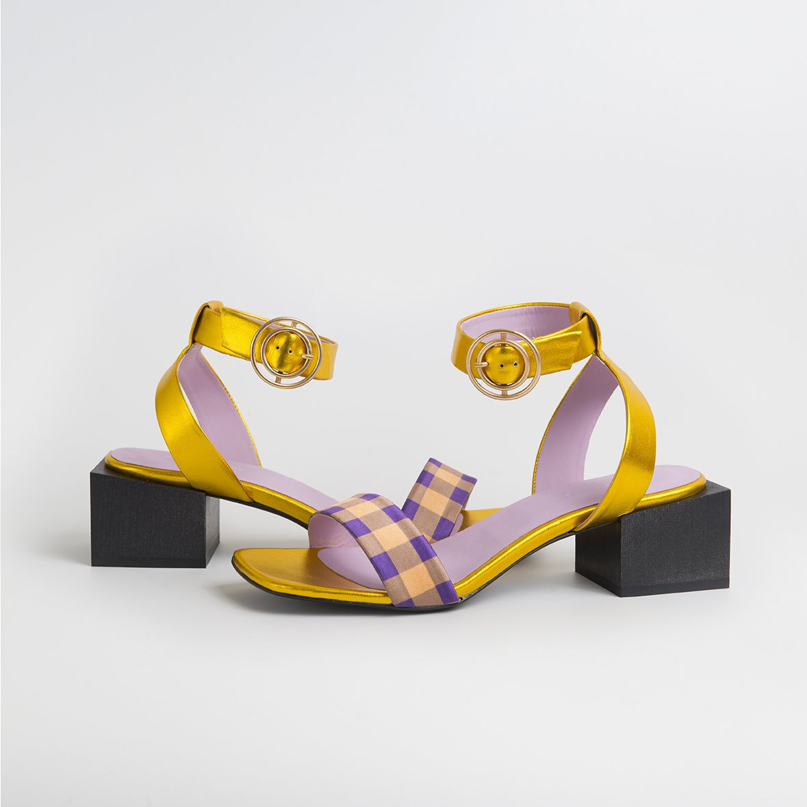 The LOLITA Gold/Purple sandals are a stunning addition to any wardrobe, combining elegance and comfort in a unique design. Handcrafted in Portugal, these sandals are made from soft metallic leather that shines beautifully in the light, making them perfect for both casual and formal occasions. The addition of plaid satin fabric adds a fun and playful touch, ensuring that you stand out wherever you go.