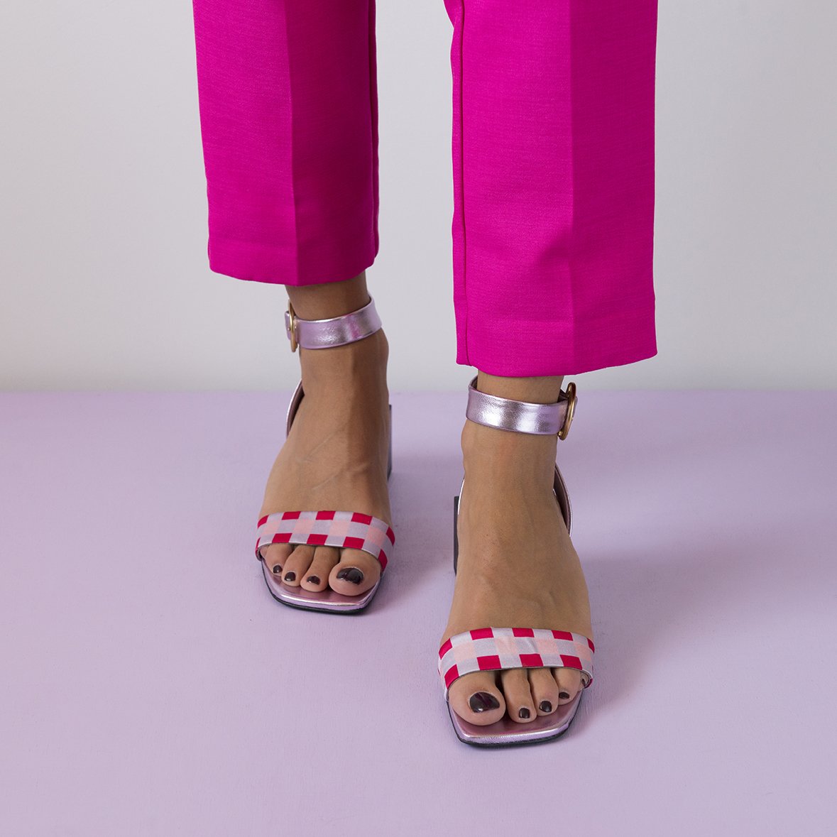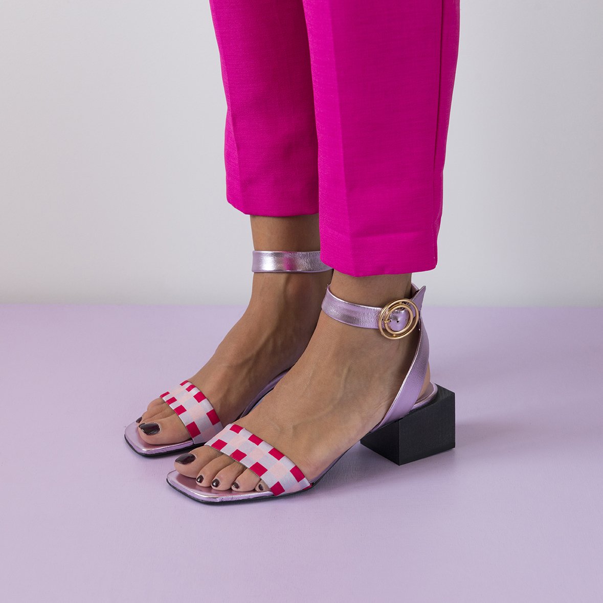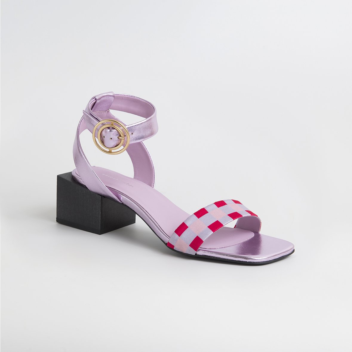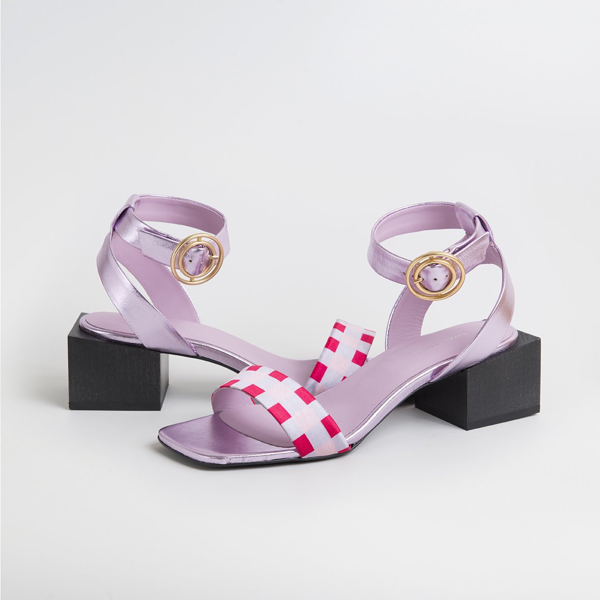 The LOLITA Lilac/Pink Sandals are a stunning addition to any wardrobe, combining elegance and comfort in one beautifully crafted design. Handcrafted in Portugal, these sandals feature a unique blend of materials that make them stand out. The upper is made from soft metallic lambskin, providing a luxurious feel, while the plaid satin fabric adds a playful touch. The square toe design not only enhances the aesthetic appeal but also offers a modern twist on traditional sandal styles.