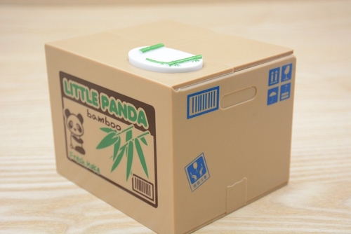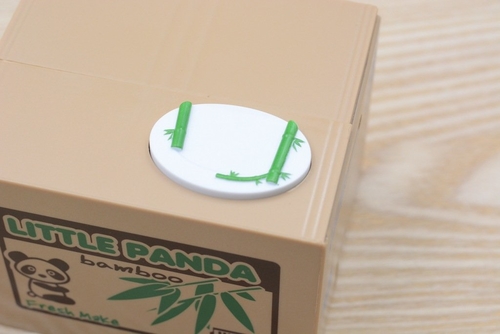 • The Itazura Bank Panda follows its predecessors in hiding in the box, to reach up and grab your coin when placed on the bamboo-decorated bowl in front.