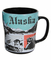 This stylishly shaped black mug features a very cosmopolitan and contemporary design scheme on colored metallic panel backgrounds. It has textured etched lettering with iconic Alaska black and white graphic images.