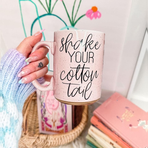 Each mug features the playful phrase 'Shake Your Cotton Tail' printed on both sides, ensuring that your inner comedian shines through while you enjoy your drink. Crafted from high-quality ceramic, these mugs are not your average coffee cups; they are a daily dose of Easter giggles that can brighten even the dullest mornings. The light speckles throughout the ceramic add a unique touch, making each mug a one-of-a-kind piece.