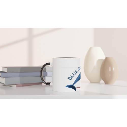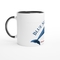 The mug's design is elegantly framed by a colored rim, inside, and handle, adding a touch of sophistication. The dolphin is beautifully printed on the white mug body, ensuring its vibrant colors stay true wash after wash.