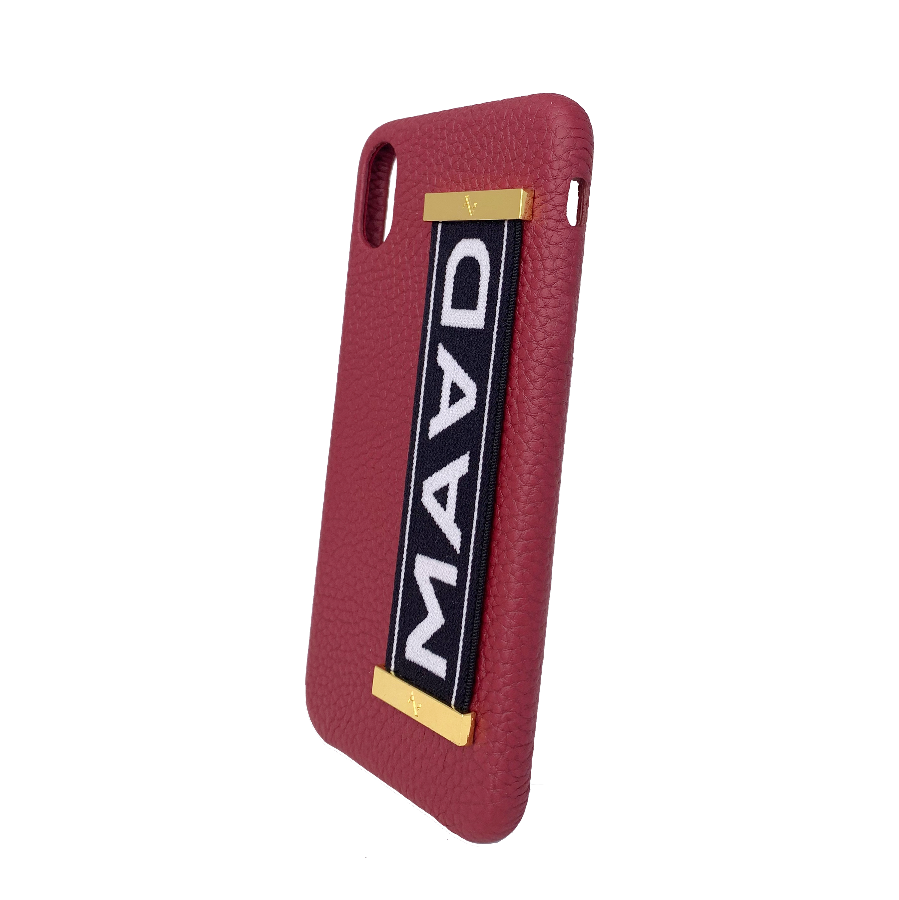 MAAD LVR Red iPhone XS MAX Case made of genuine pebble leather with an elastic strap, showcasing a stylish black and red design.