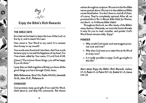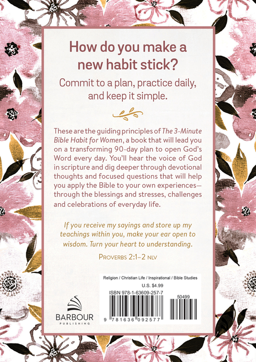 These are the guiding principles of The 3-Minute Daily Bible Habit for Women, a book that will lead readers on a transforming 90-day plan to open God’s Word every day. Readers will hear the voice of God in scripture and dig deeper through devotional thoughts and focused questions that will help them apply the Bible to their own experiences—through the blessings and stresses, challenges and celebrations of everyday life.