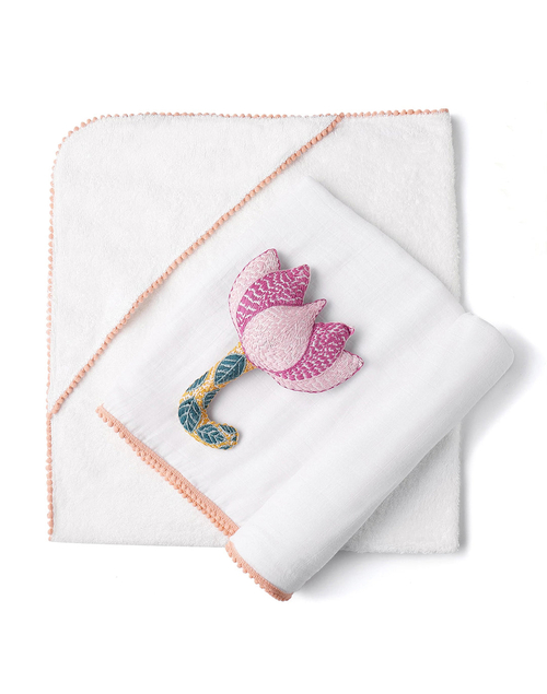 Includes hooded towel, swaddle, rattle