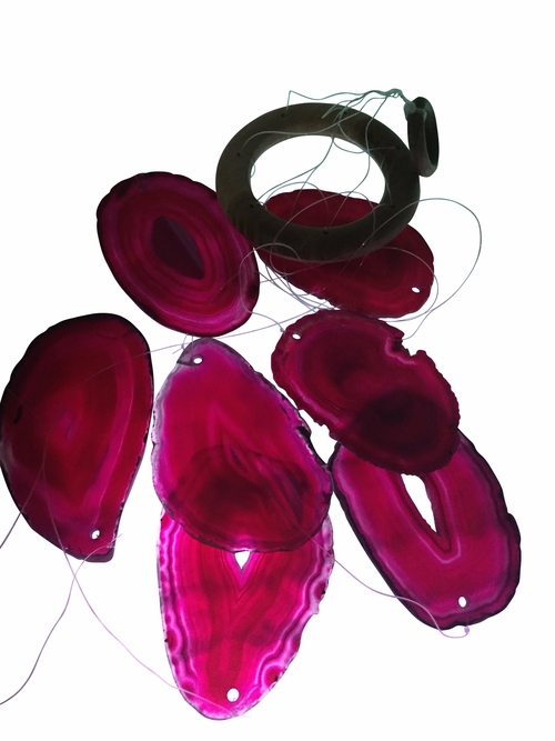 The Agate Necklace is available in three captivating colors: Pink, Blue, and Brown. Each color is carefully selected to highlight the natural beauty of the agate stones, making every piece unique. The necklace features seven pieces of agate, each slab showcasing its own distinct patterns and hues, ensuring that no two necklaces are alike.