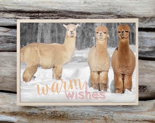 A beautifully designed Alpaca Greeting Card featuring the phrase 'Warm Wishes' on the cover, showcasing a charming alpaca illustration.