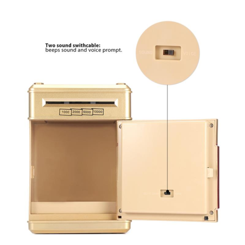 With a password, voice, in addition to saving money, but also to establish savings goals, financial planning. Can be used to store toys, jewelry, bankbooks, etc. The slot in the coin slot can hold COINS or paper money.