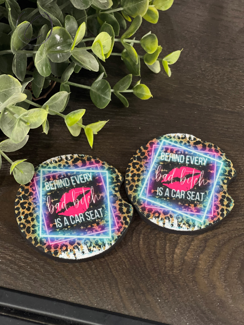 This coaster set is designed to match the popular Behind Every Bad B**** tumbler, making it a perfect gift for yourself or a friend. Together, they create a cohesive look that showcases your style and attitude. Whether you’re sipping coffee on your morning commute or enjoying a refreshing drink on a road trip, these coasters will keep your car looking chic.
