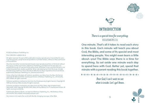 Devotional Minutes for Boys features 180 easy-to-understand truths from God's Word--and each devotion can be read in just sixty seconds or less! Your boys, ages 5 to 8, will be introduced to dozens of themes from scripture that are as relevant today as they were in Bible times. Featuring scripture selections from the New Life Version plus short prayer starters, every turn of the page promises biblical encouragement and inspiration for a boy's daily life.