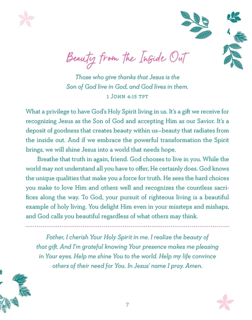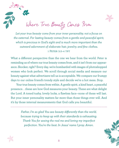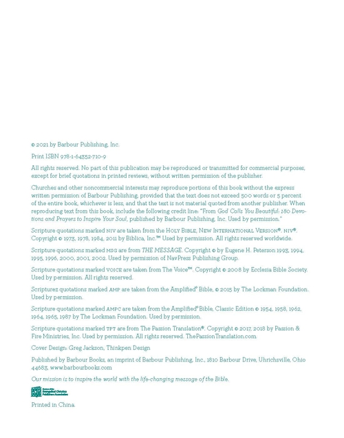 This delightful devotional--created just for you--will encourage and inspire your soul with deeply rooted truths from God's Word. Each devotional reading and heartfelt prayer will assure you that you are truly beautiful--because God says so. . .and His Word is unchanging! Each of the 180 readings in God Calls You Beautiful will help you to grow in your faith and increase your self-confidence as you become the lovely, courageous woman the heavenly Creator intended you to be! This attractive package features a ribbon marker and two-color interior design. . .a great gift for women of all ages!